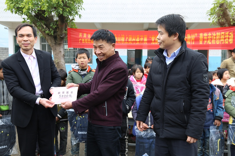 上午10点,一行人首先来到上团村小学,集团党支部书记谢家伟代表集团公司向学校捐赠5000元教育基金,兴宾区委办为学生们送来了书包、文具等学习用品,学校校长代表学校接收5000元教育基金,学生们接过书包,老师与学生们都纷纷表示感谢,谢书记讲到“知识改变命运,希望小朋友们从小努力学习,常怀感恩之心,长大后都能成为祖国的栋梁,为建设家乡、改变家乡努力,用自己的行动回报国家、回报社会”。之后,慰问组一行来到上团村委,谢书记代表集团公司为21户贫困户、9户五保户送去慰问金共15000元。随后,慰问组走访慰问了两户贫困户,谢家伟书记与杨杰副主任亲切的与贫困户交谈,关切的问候他们的身体状况,并详细了解贫困户家中的具体情况,叮嘱他们保重身体,鼓励他们乐观面对生活。