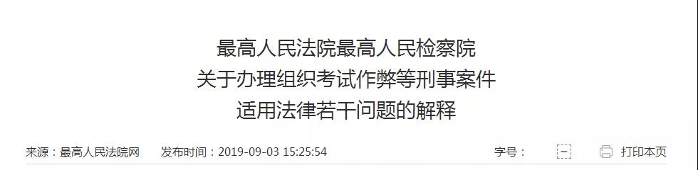 9月3日,最高人民法院、最高人民检察院联合发布《关于办理组织考试作弊等刑事案件适用法律若干问题的解释》。